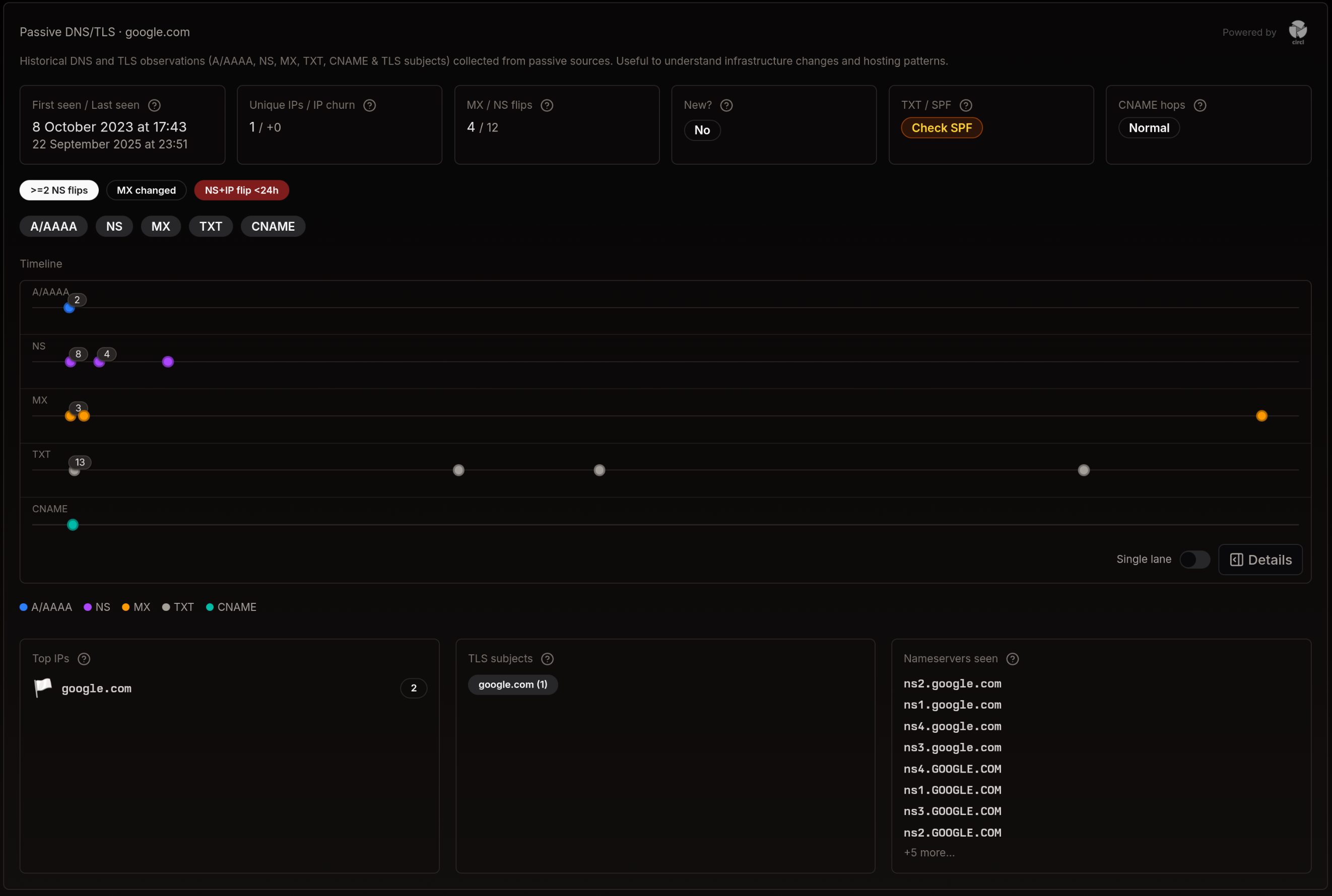 Section titled “Investigating with Passive DNS/TLS”Passive DNS/TLS helps analysts reconstruct historical DNS changes and discover adjacent infrastructure (IPs, nameservers, MX, and certificate subjects) related to a domain. This is useful for understanding hosting moves, provider changes, and relationships between suspicious domains.