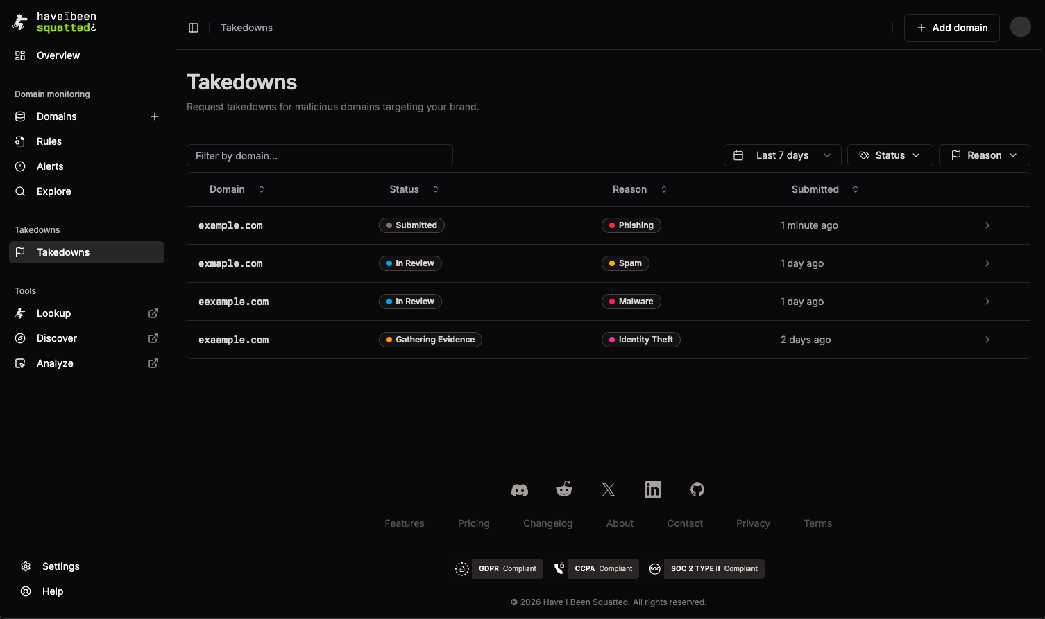 Section titled “1. When to submit a takedown”- Submit requests for domains actively impersonating your brand or services